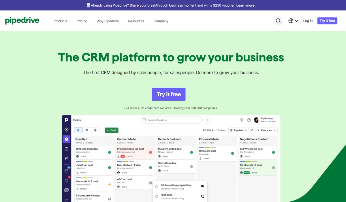 With its intuitive sales pipeline management, robust activity and task management, comprehensive contact and lead management, and advanced reporting and analytics capabilities, Pipedrive equips sales teams with the tools they need to close deals faster and drive revenue growth.